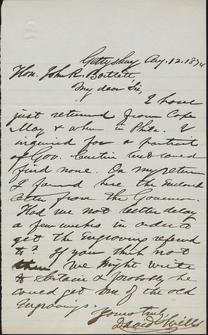 Note relates that he returned from a visit to Cape May and Philadelphia. He made inquiry regarding a portrait of Governor Curtin finding that there is not one ready to hand suggests a delay in order to get an engraving made by (John) Sartain. Upper left corner embossed seal.