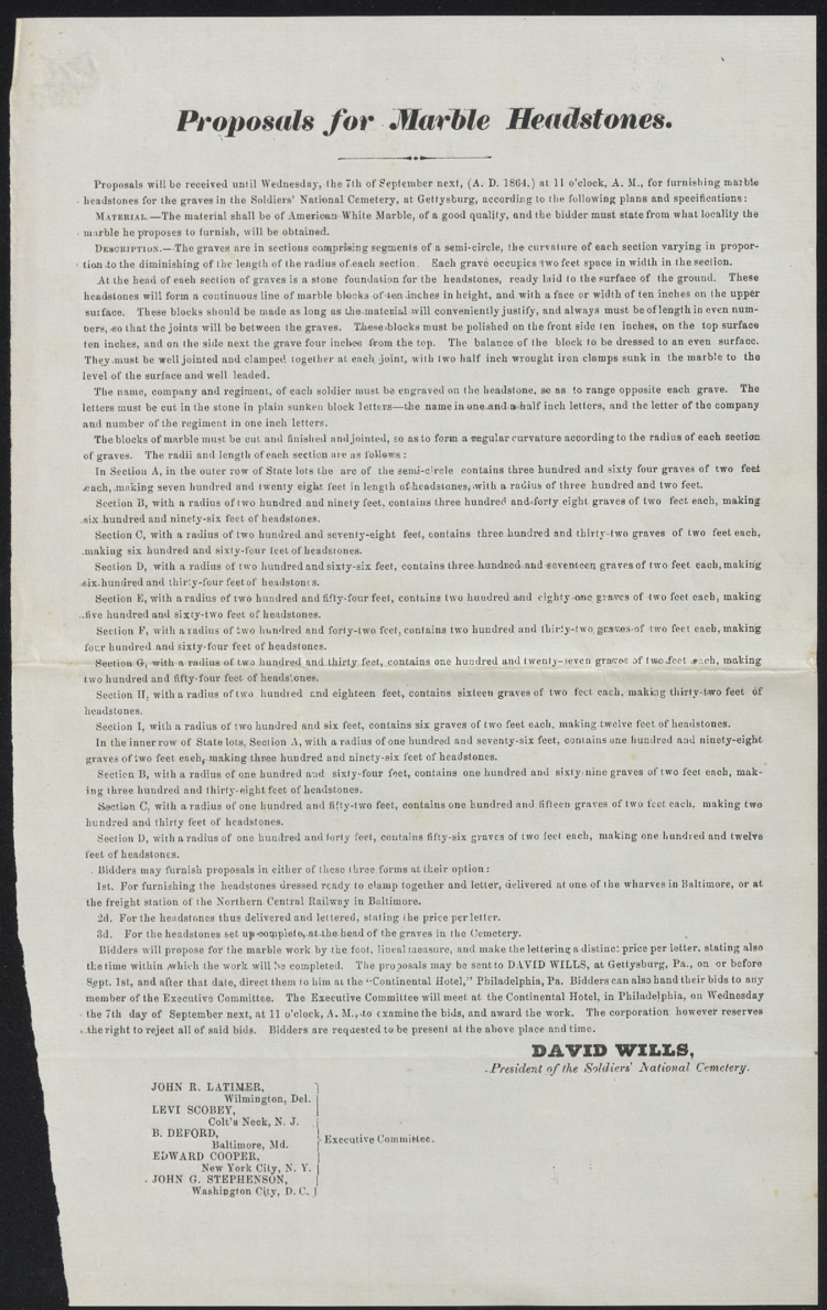 Proposals for Granite Headstones. David Wills, President of the Soldiers' National Cemetery. Proposals will be received until Thursday, the 5th of January next (A.D. 1865,) at 12 o'clock, noon, for furnishing granite headstones for the graves in the Soldiers' National Cemetery, at Gettysburg, according to the following plans and specifications: (Material and Description are listed as well as grave site sections'dimensions. The five members of the Executive Committee are listed: John R. Latimer, Levi Scobey, B. Deford. Edward Cooper. W.Y. Selleck, David Wills, Gettsyburg, PA., Dec. 12, 1864. There is double column print on ivory colored paper measuring 20 cm x 31.5 cm, upper right corner has embossed seal possibly of an eagle.)