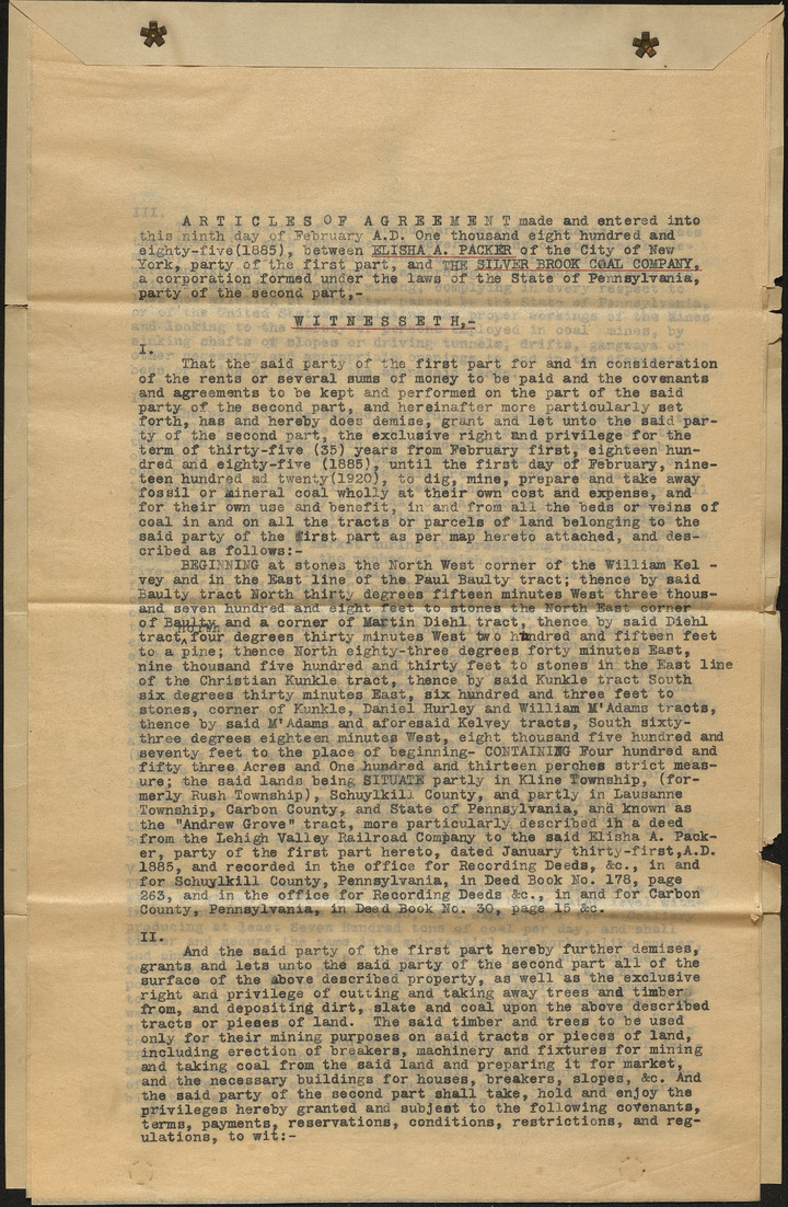 1885 October 9 Articles of Agreement made between Elisha A. Packer and the Silver Brook Coal Company and envelope No Date Lehigh Valley Railroad Company Real Estate Dept. List of Papers on File: Lease Elisha Packer & Silver Brook Coal Co.