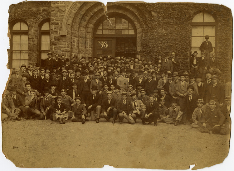 Class of 1893 wearing hats or caps assembled before an ivy clad stone wall laboratory (chemistry lab?) - 93 stenciled on door