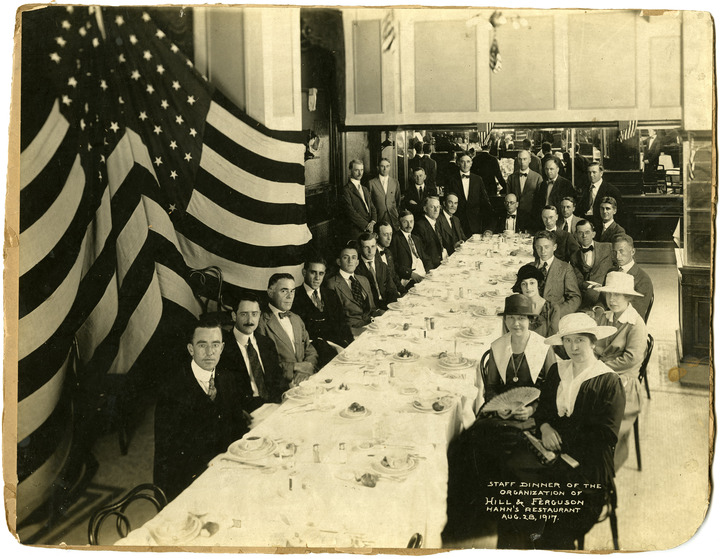 Group photo - Staff Dinner of the Organization of Hill & Ferguson Hahn s Restaurant (New York City) Aug. 28, 1917, Harry J. Atticks - 1st man standing on left, damage to edges, on reverse pencil drawings and ID list of each person in photograph.