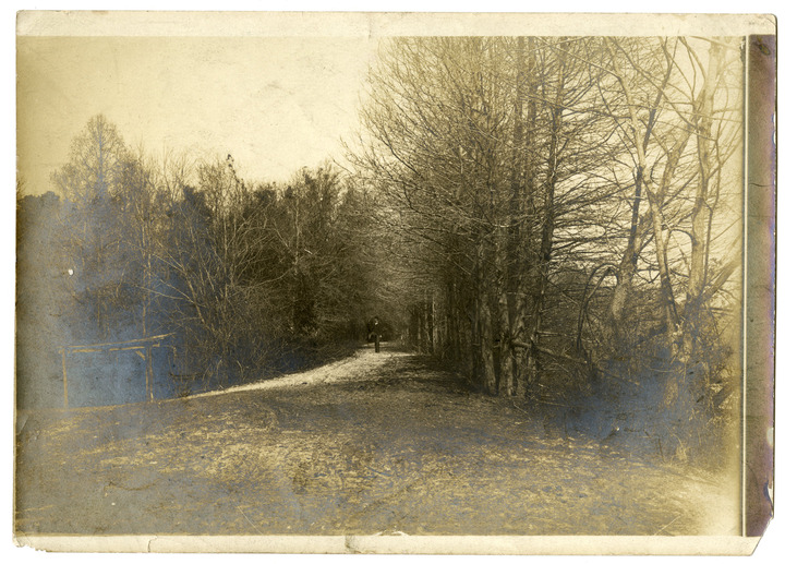 Landscape - Forest Path through Trees, Man in Distance Center of Image, Wooden Gate at Left. https://preserve.lehigh.edu/digital-special-collections/lehigh-photographs/landscape-forest-path-through-trees-man-distance.