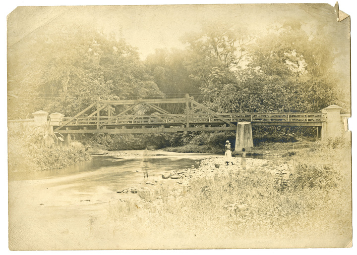 Landscape of Queen Post Wooden Bridge across Rocky Stream, Concrete Piers, Three Children at Stream S Edge, Trees in Background. https://preserve.lehigh.edu/digital-special-collections/lehigh-photographs/landscape-queen-post-wooden-bridge-across-rocky.