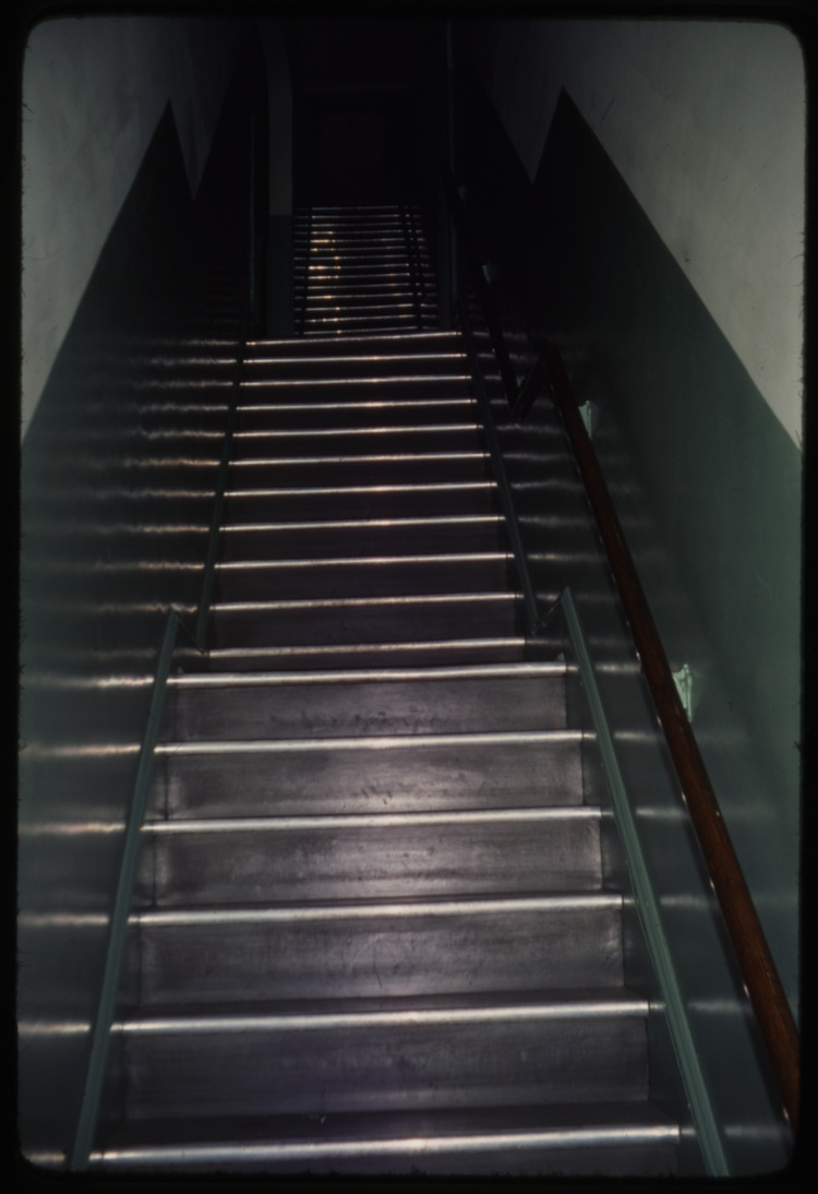 “Slide 187 Metal Staircase With Wooden Railing Leading to a Dark Room”. 1976. https://preserve.lehigh.edu/digital-special-collections/local-history/tamar-e-bair-photo-slides/slide-187-metal-staircase.