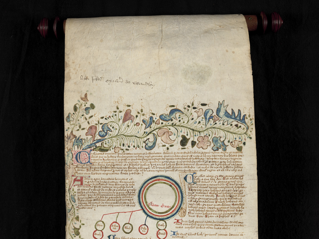The Latin text on this parchment roll written in England in the fifteenth century is based on the text on a roll presented by Carmelite friar Roger of St. Albans to Henry VI, tracing the genealogy of kings from Adam to Henry VI. On this roll the genealogical diagram has been extended to include the reign of Edward IV but does not record his wife, so it was made after his coronation in 1461 but before his marriage in 1465. The verso is blank except for a French title added at the top: "Chronique des Annales du Monde et particulierement des Dinasties des Rois d' Angleterre commencant à Brutus et finissant à Henry VI."