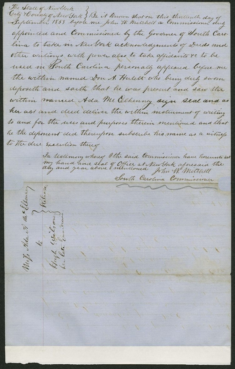 Mitchell is "a comissioner duly appointed and Commissioned by the Governor of South Carolina" to handle legal forms in New York that may be used South Carolina. He confirms Don A. Hulett was present when Ada Clare signed and sealed the "within instrument of writing."