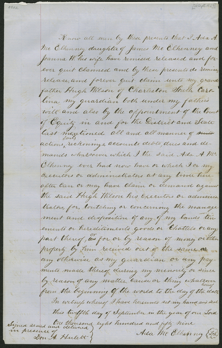 [Legal Release] 12 September 1859, [New York, NY] [to] Hugh Wilson / Ada McElhenney