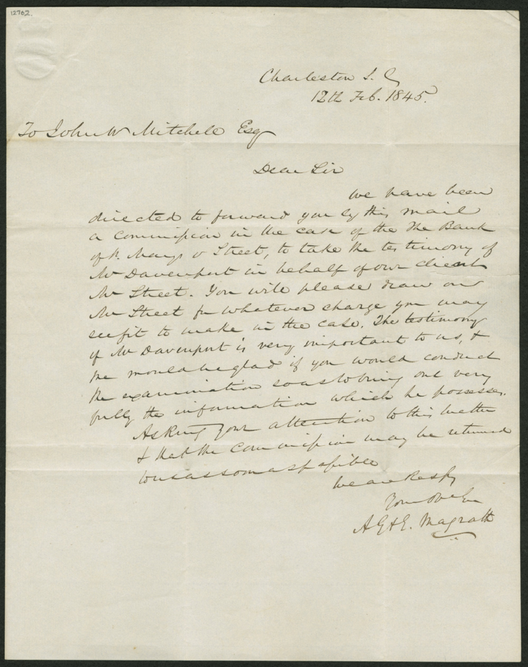 [Letter] 12 February 1845, Charleston, SC [to] John W. Mitchell / A.G. & E. Magrath